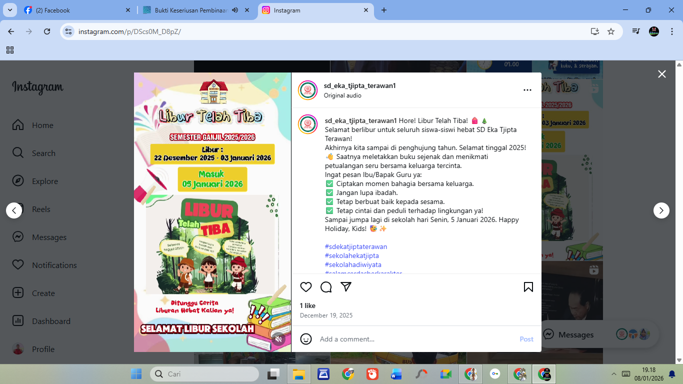 Hore! Libur Telah Tiba! 🎒🌲Selamat berlibur untuk seluruh siswa-siswi hebat SD Eka Tjipta Terawan!Akhirnya kita sampai di penghujung tahun. Selamat tinggal 2025! 👋 Saatnya meletakkan buku sejenak dan menikmati petualangan seru bersama keluarga tercinta.Ingat pesan Ibu/Bapak Guru ya:✅ Ciptakan momen bahagia bersama keluarga.✅ Jangan lupa ibadah.✅ Tetap berbuat baik kepada sesama....
